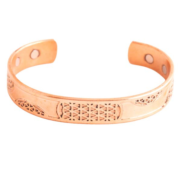Bezaubernder Kupferarmreif mit Blume des Lebens Gravuren und 6 Magneten für den Biomagnetismus. Schutzarmreifen mit doppelter Wirkung.
