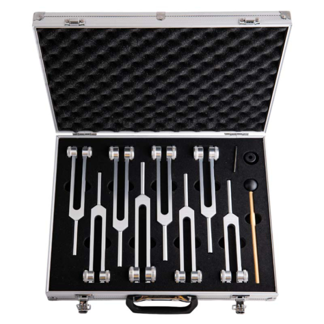 Das Chakra-Stimmgabel-Set besteht aus Stimmgabeln, die mit den sieben Hauptchakren des Körpers und einem zusätzlichen Chakra, dem höheren Herzchakra oder dem Thymuschakra verbunden sind. Die Wirkung eines Chakra-Stimmgabel-Sets ist vielfältig und umfasst acht Stimmgabeln aus Aluminium, Stimmgabelständer, Klangstab und Sechskantschlüssel. Alle Teile werden in einem Aluminiumkoffer inklusive Beschreibung geliefert.
